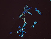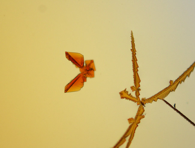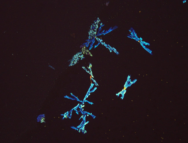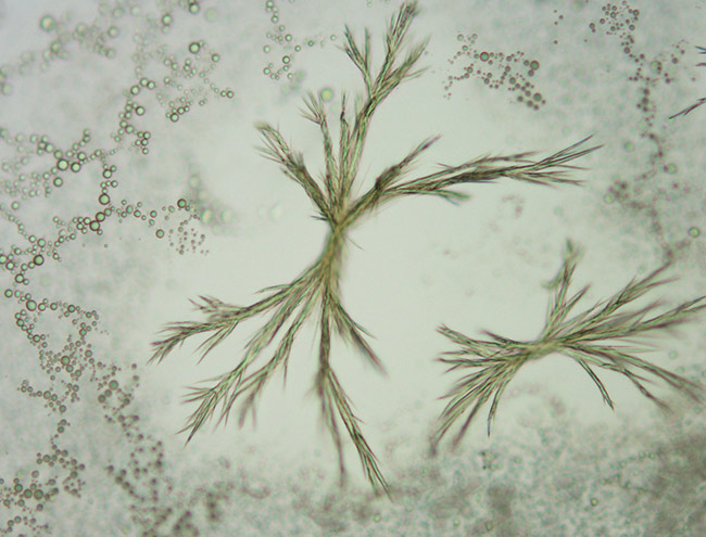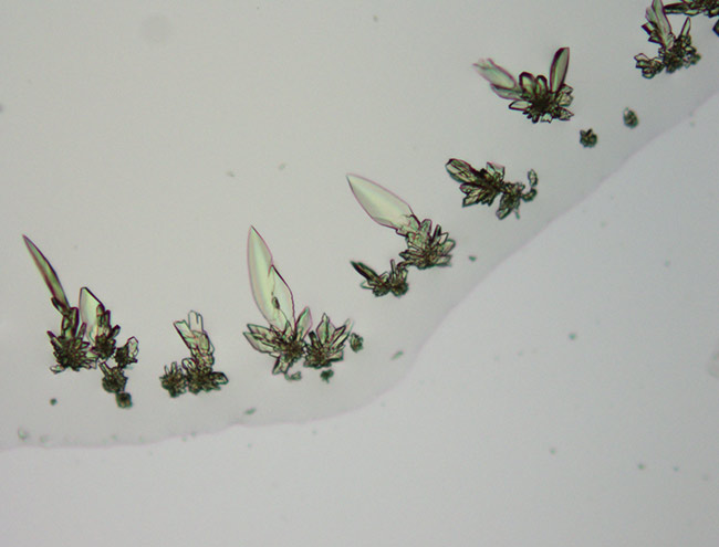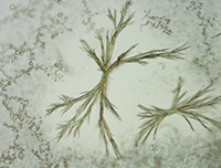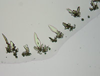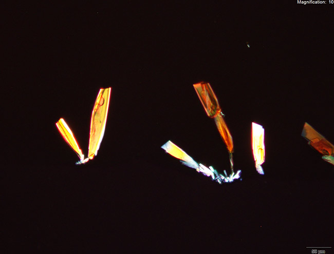 Chemical reference standards for all substances were purchased from Cayman Chemical (Ann Arbor, MI) a 1 mg/mL methanolic solutions or as 1 mg solids. The solids were dissolved in 1 mL methanol for the study. Reagents used in this study were made as per the recipes listed below. A drop of test solution was placed on a glass slide to achieve a dried residue amount between 1- 30 µg depending on the analyte. The residue was dissolved in 5-10 µL of water, 10% hydrochloric acid or 10% acetic acid solutions. To this drop, 10 µL of reagent was added and the drop mixed to stimulate crystal growth. Microcrystal formation time, shape, habit and features under crossed polars were observed and documented.