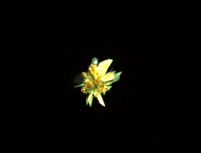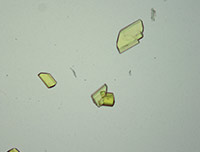A Leica DM 750P polarized light microscope and an Olympus BX43F polarized light microscope were used to observe the resulting microcrystals. Characteristic microcrystals were documented as photomicrographs in the Olympus cellSense Entry imaging software at 100-200x magnification. A Thermo Scientific™ Nicolet™iN™10 Infrared Microscope with a liquid nitrogen cooled mercury, Cadmium, Tellurium (MCT) detector was used for analysis. All data was processed and analyzed in the Thermo Scientific™ OMNIC™ Picta™ software. The spectra were collected in transmission mode on AMTIR windows. Crystals grown on glass slides were carefully moved to the AMTIR windows with Microtools(MiTeGen LLC, Ithaca, NY). Excess reagent was wicked away with fine paper wicks and the crystals were washed with chloroform. This procedure removed interferences in the spectra and improved the quality of the infrared spectrum collected for a microcrystal.