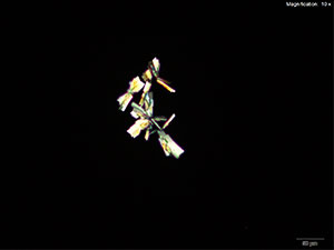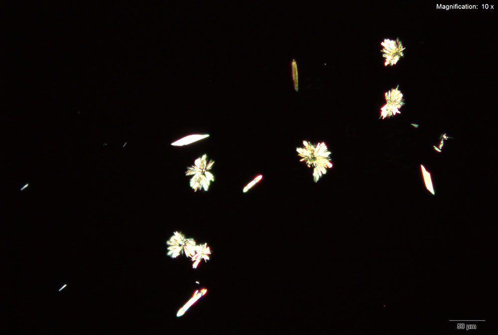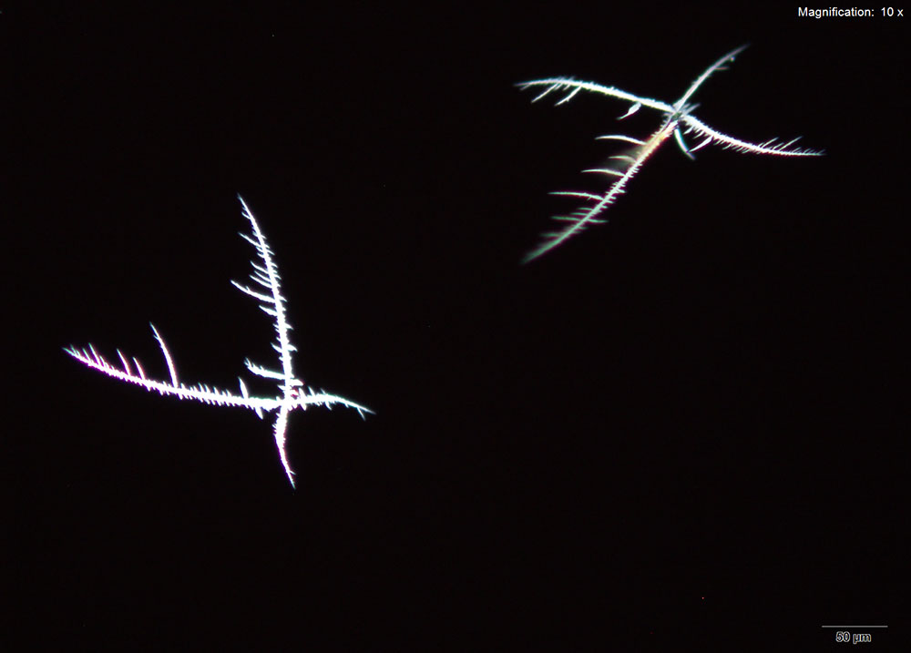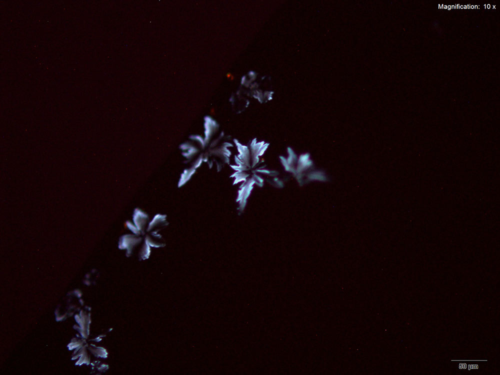 Colorless, light floral dendrites of 25NBOMe are formed with the acidic gold chloride reagent. The crystals are formed like a floating skin at the edge of the drop and can be best visualized under crossed polars.