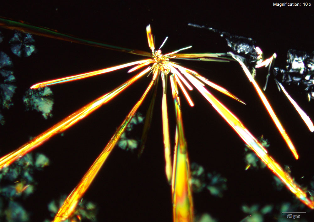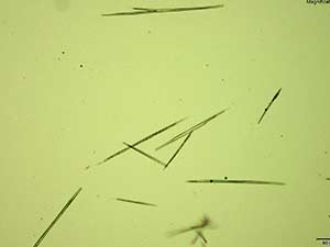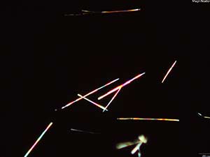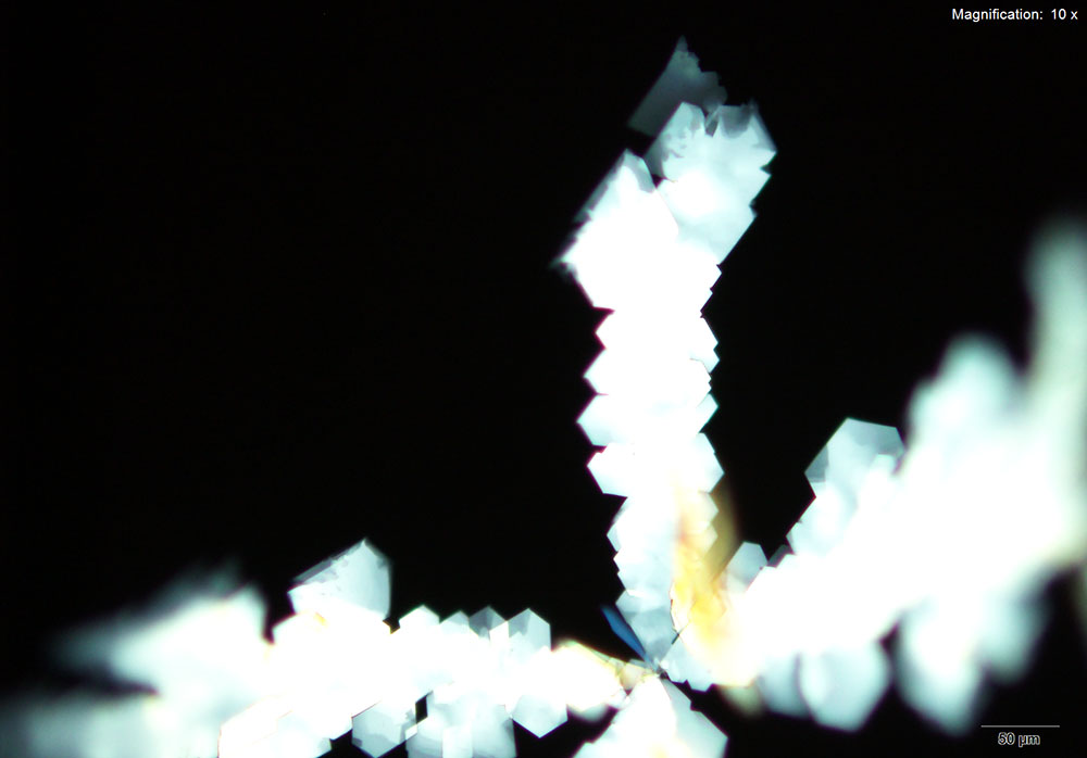 Two forms of crystals are observed with the acidic gold chloride reagent. The hexagonal plates are more prominent and grow as large stacks. They appear bright white or bluish white under crossed polars. Flat thin blades that appear as needles when oriented on their sides are also observed. These are brightly colored under crossed polars.