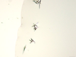 Mercuric chloride reagent gives colorless, long, flat blades that grow into the drop from the edge of the drop. When the blades grow in the drop, they grow as loose clusters of short blades. Both forms of the crystal grow quickly and are readily observed under brightfield and crossed polars.