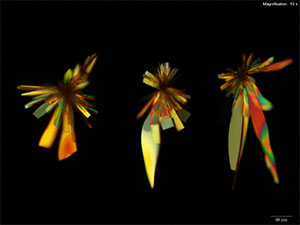 Butylone in gold bromide reagent gives small (15-30 μm), red, and rod-like prisms that grow abundantly but slowly (~ 15-20 mins). The crystals grow abundantly once crystal formation begins. The distinct red crystals are bright under crossed polars and go completely extinct upon rotation of the stage.