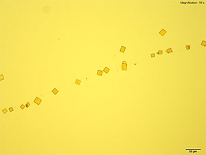 Platinic chloride reagent forms small, colorless square plates in the drop. These plates can also be observed on the edges of drop with deformations. The size of the plates differs depending on if 10% hydrochloric acid or 10% acetic acid was used to dissolve the drug residue. Platinic chloride reagent by itself crystallizes as square plates on standing. They appear very similar to the drug-reagent crystal observed in this test. However, the drug-reagent plates can be differentiated from the reagent crystals under crossed polars. The reagent crystals are dark or faintly visible under crossed polars while the drug-reagent crystals appear bright white or yellow.