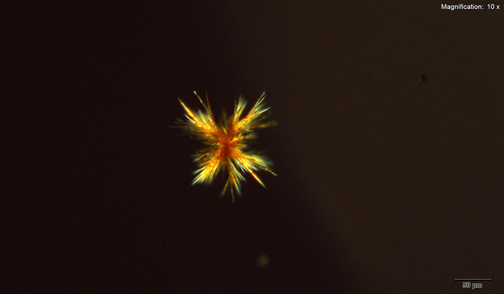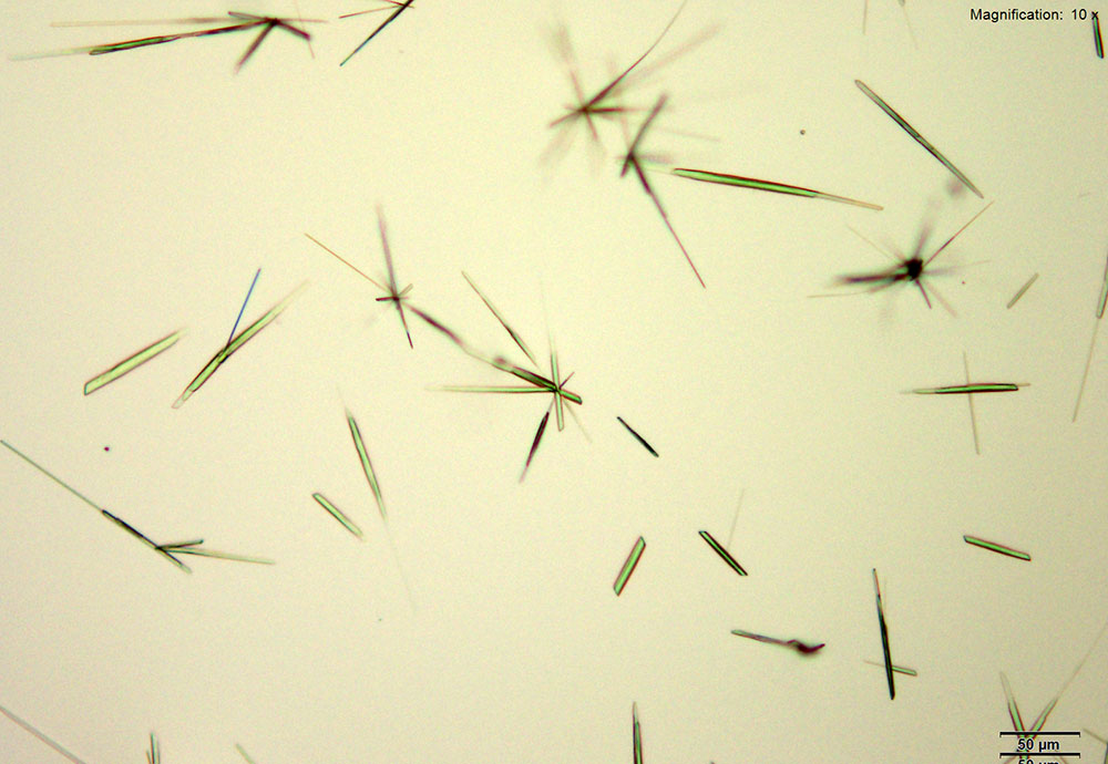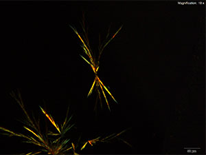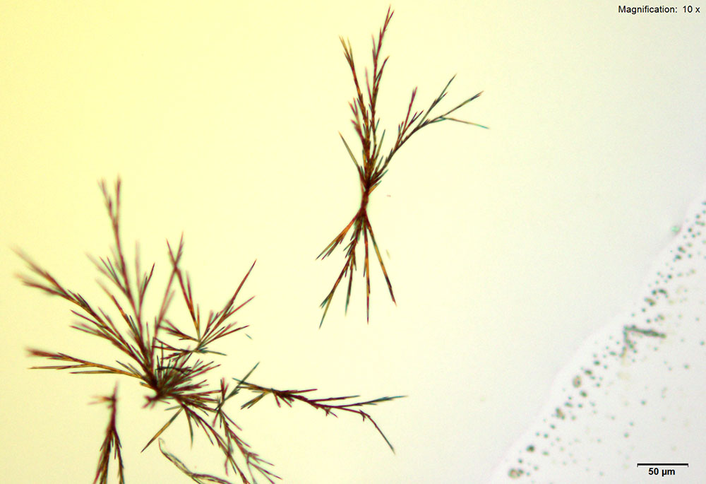 In the acidic gold chloride reagent, ethcathinone at amounts greater than 20 μg slowly forms yellow, flat straw-like crystals. The crystals grow either individually or in clusters.