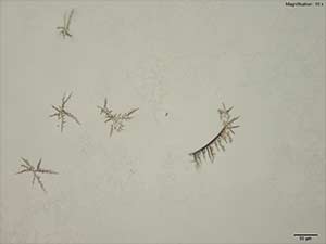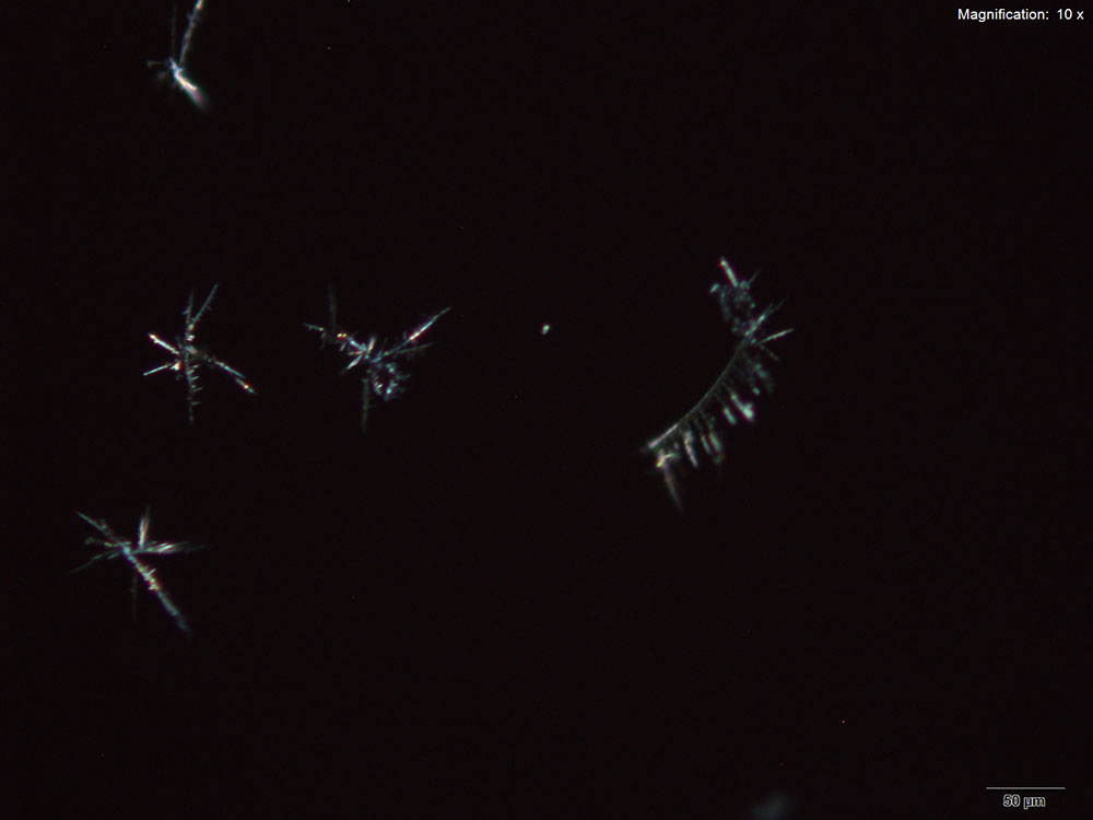 Fentanyl forms dark branched comb or feathery clusters with aqueous gold chloride. In acidic conditions the crystal forms get smaller. In aqueous conditions, the crystals grow very long and highly branched. The formations are very bright under crossed polars and more details are visible. In light of the safety issues associated with fentanyl, handling this test with powders is not advised. However, these results are given to caution analysts who may encounter these formations as part of mixed street samples