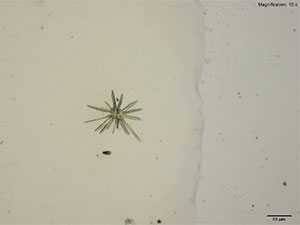Furanyl fentanyl forms clusters of thin, colorless plates with platinic chloride reagent. The crystal habit differs between the three solvents of water, 10% hydrochloric acid and 10% acetic acid. The largest and most reliable crystals are formed with 10% hydrochloric acid. In water, the individual crystals in the cluster are a mix of narrow rod like structures and light feathery plates. The clusters in 10% hydrochloric acid are larger with a mix of short and long plates. The clusters get tighter with short and broad plates in 10% acetic acid. All three forms of the crystals appear bright under crossed polars.