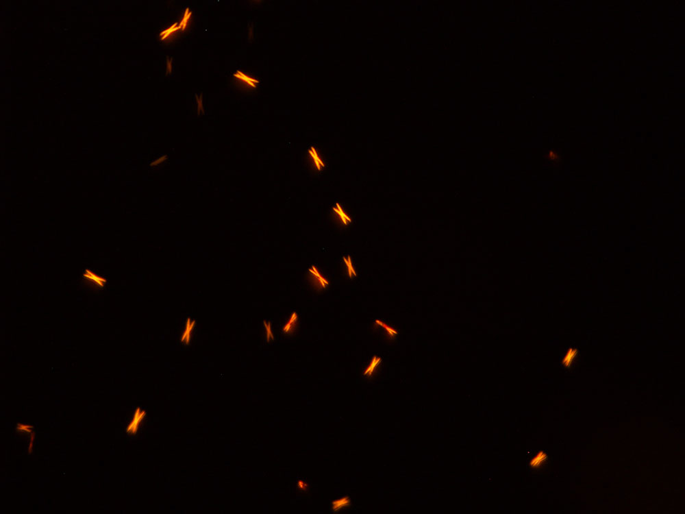 Methcathinone in the acidic gold bromide reagent gives small, orange x-shaped crosses that are better characterized under higher magnifications as shown in images 3 and 4 above. The crystals form abundantly with methcathinone amounts below 10 μg.