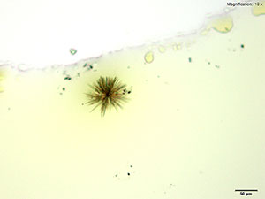 Methylone in 10% hydrochloric acid with gold chloride reagent Methylone in 10% hydrochloric acid with gold chloride reagent gives different sized burrs of colorless needles. The burrs appear dark in the center with colorless sharp needles on the periphery. Under crossed polars, the burrs are very bright and appear to have 4 quardrants in the circle.