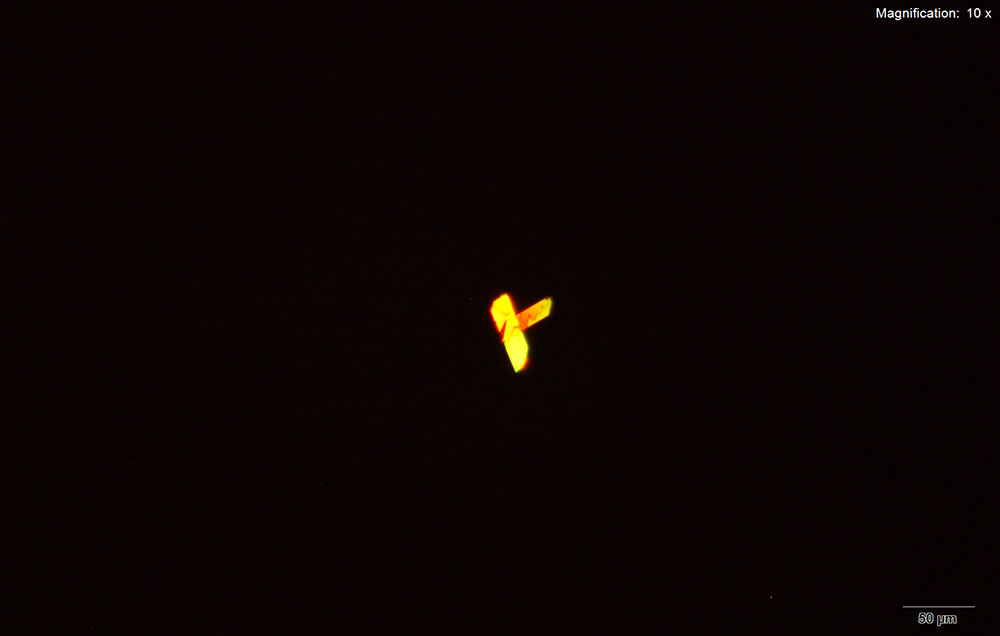 Methylone in gold bromide reagent gives red, wispy hair like crystals that grow as loose sheaves or rosettes. The crystals may be large or small but are easily recognized under crossed polars.