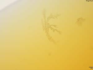 W-18 was obtained as a solid and has poor solubility for all the solvents tested in this study. Even when partial dissolution was achieved, no characteristic crystal formation was observed for any of the reagents. With the gold bromide reagent upon standing, yellow feathery branches were observed. These structures are very faintly visible in crossed polars. This test cannot be used reliably for W-18.