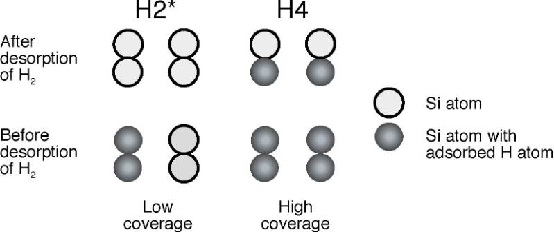 Hydrogen adsorption leads to changes in the silicon surface. The surface structure relaxes and both its geometry and vibrational properties change in response to adsorption. This effect is generally greater on the surfaces of covalent solids such as semiconductors. While such effects may also be important on metal surfaces, the most studied case of hydrogen on copper does not exhibit a similarly strong dependence on coverage. For hydrogen on silicon, the changes introduced are so strong that there appears to be one mechanism that describes dissociative adsorption of H2 into two H atoms on the surface at low coverage (with little adsorbed H on the surface, denoted H2* in the figure below or intradimer desorption) as compared to high coverage (when there is nearly one adsorbed H atom on every surface Si atom, denoted H4 in the figure below or interdimer desorption). The adsorption and desorption of hydrogen is of great interest from a fundamental viewpoint since it is (supposedly) the simplest reaction of a molecule with the most important semiconductor. However, it is also of practical interest because the adsorption and desorption of hydrogen play an important role in the chemical vapor deposition (CVD) of silicon from silanes (such as SiH4and Si2H6), which is important in the integrated circuit industry.