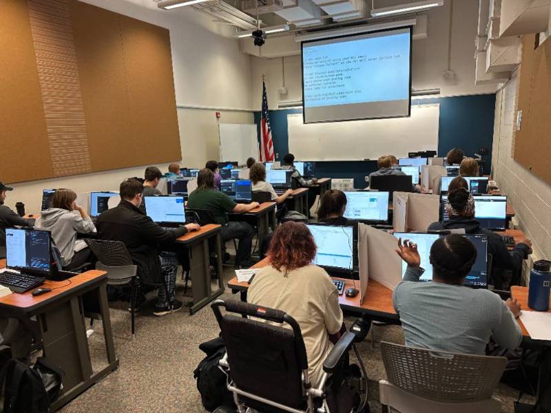 The Computer Science Department hosted HACKWCU on Friday, November 14, 2025. Several local school districts sent teams of students to compete in the competition. WCU Computer Science students helped create a Design and  Design and Code competition for the event. The attendees each recieved a microbit and instructions on how to set it up. They competed in a Rock/Paper/Scissors challenge with the microbits.