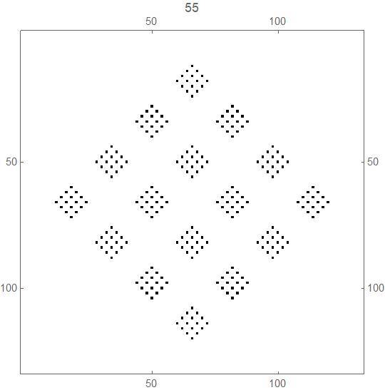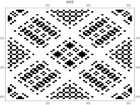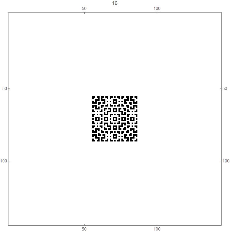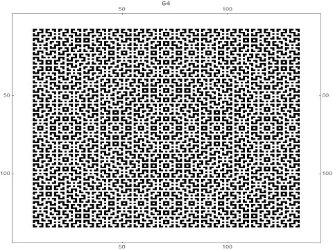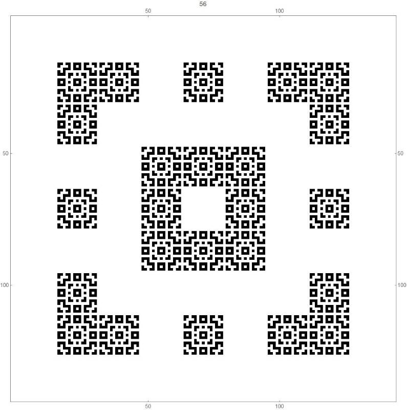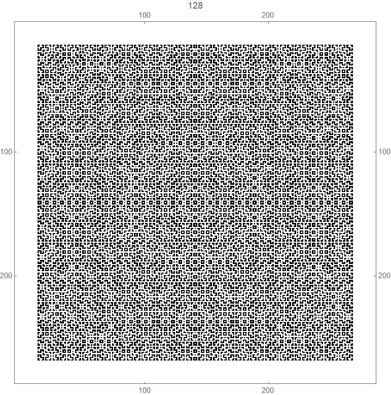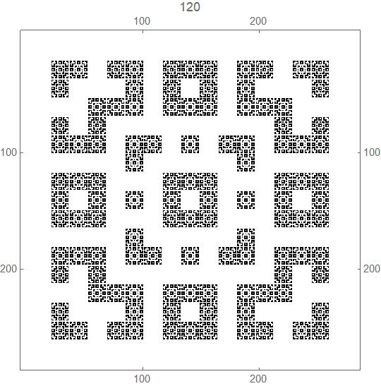 c) As the CA runs through the generations, it appears to exhibit fractal behavior. See below for example, where the pattern at generation 120 looks like the pattern at generation 8, while this same pattern may also be found within the 15x15 squares at generation 120 that correspond to the 1x1 black squares at generation 8.