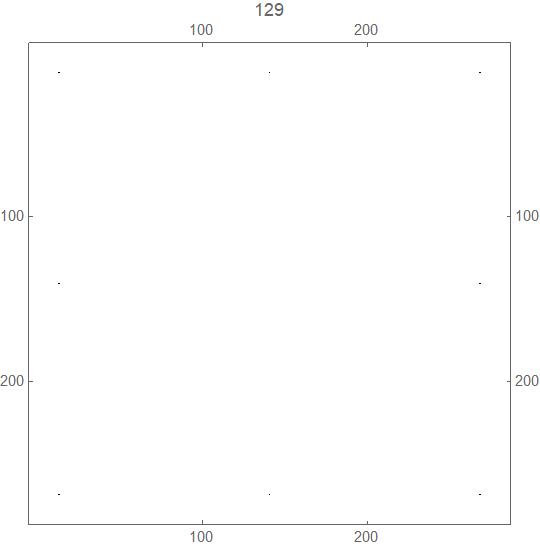 The transition from generation 128 (white and black squares both "dense" in the sense defined above) to generation 129 (just 8 black squares):