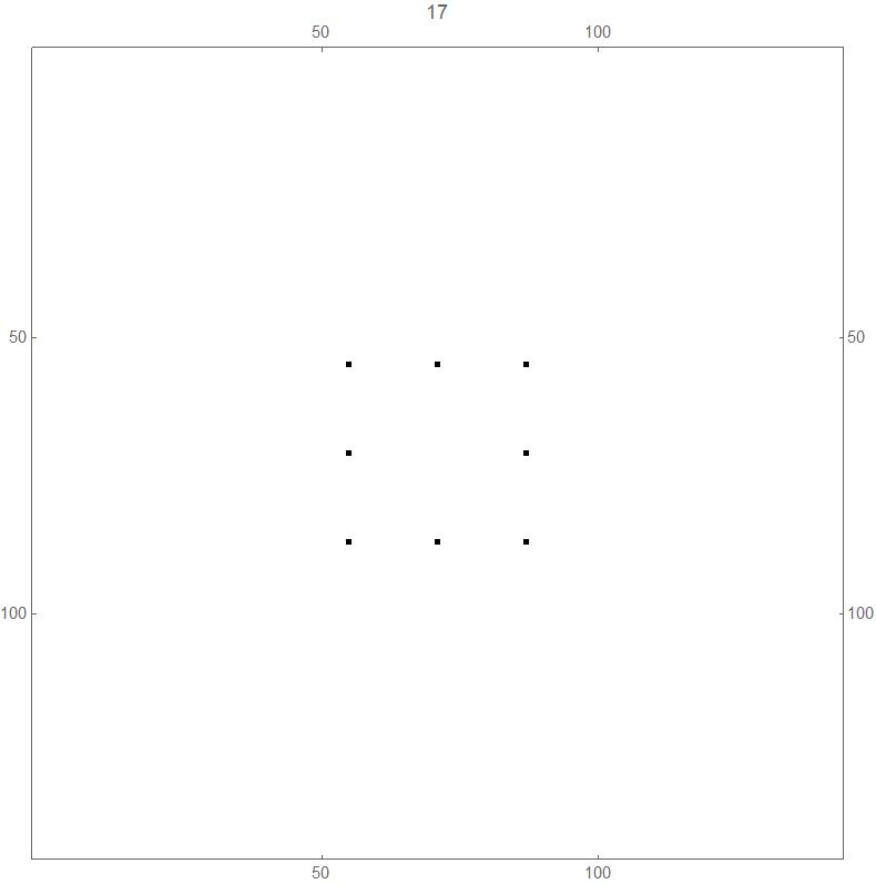 The transition from generation 16 (white and black squares both "dense" in the sense defined above) to generation 17 (just 8 black squares):