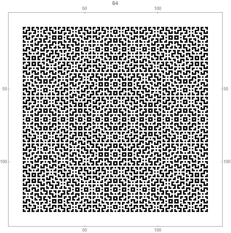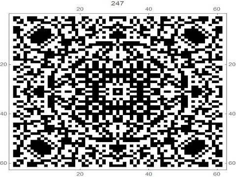 The transition from generation 64 (white and black squares both "dense" in the sense defined above) to generation 65 (just 8 black squares):