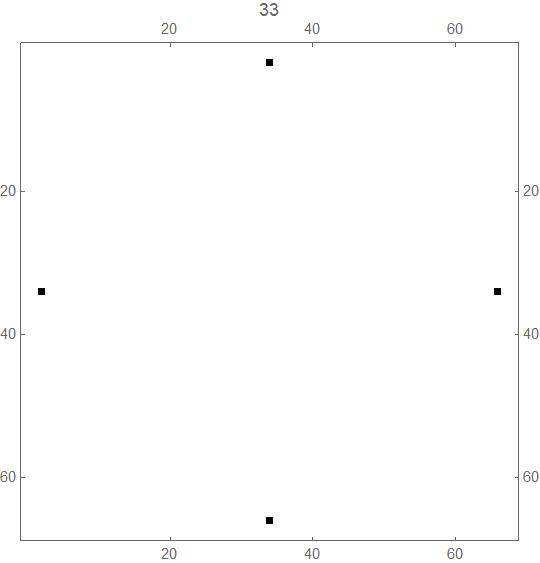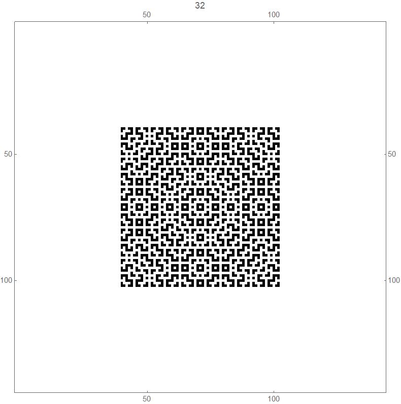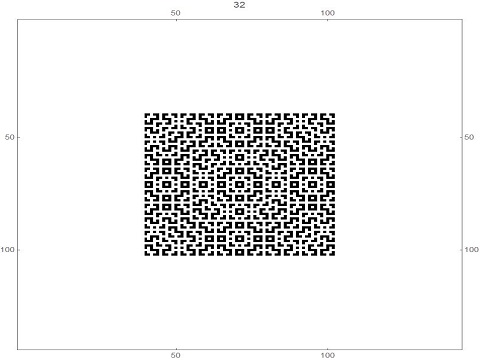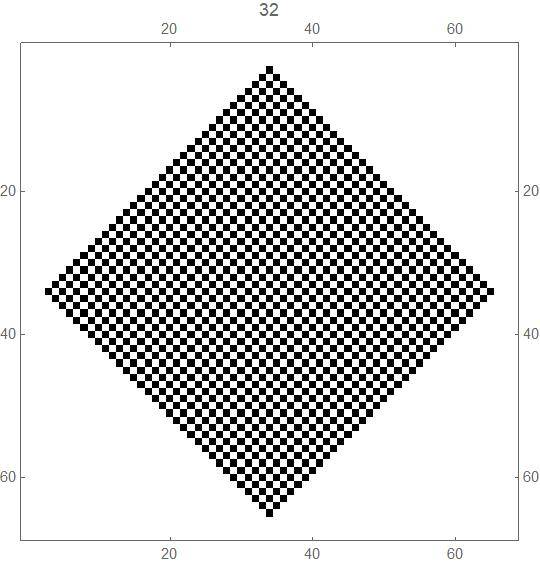 The transition from generation 32 (alternate white and black squares) to generation 33 (just 4 black squares):