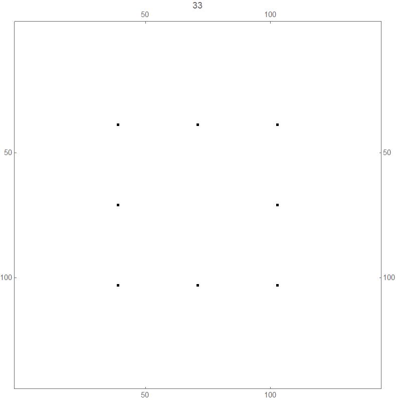 The transition from generation 32 (white and black squares both "dense" in the sense defined above) to generation 33 (just 8 black squares):