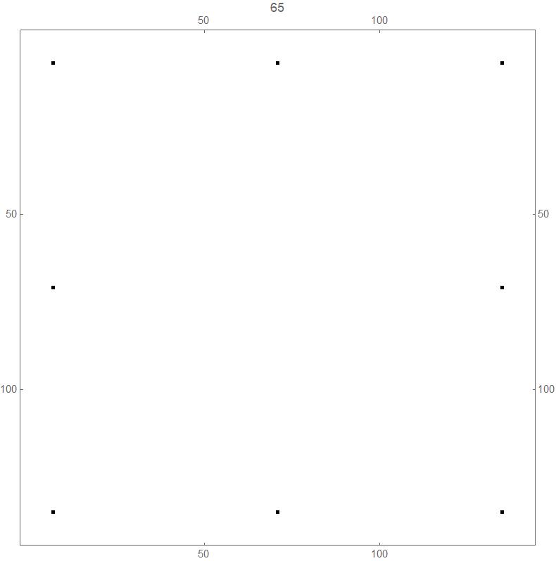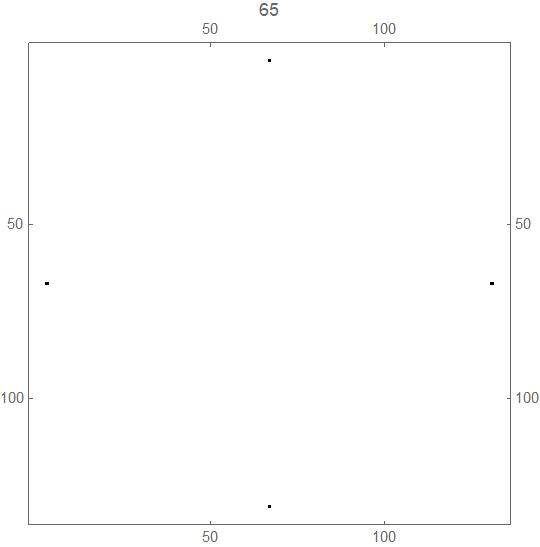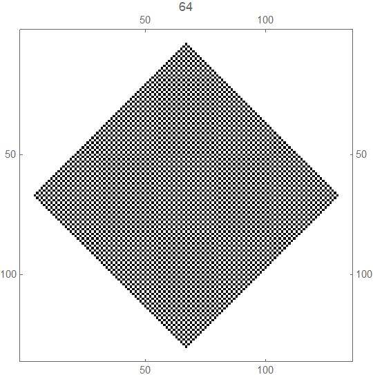 The transition from generation 64 (alternate white and black squares) to generation 65 (just 4 black squares):