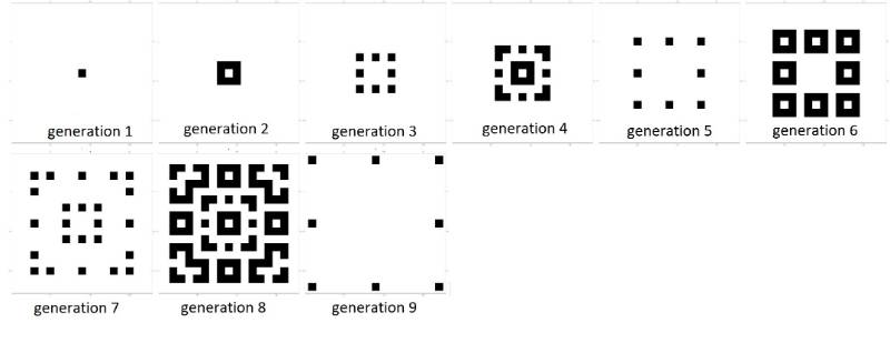 The fact that the number of possible arrangement of black and white squares in a square array of side n is 2(n^2) means that the sequence of patterns must eventually start to cycle.