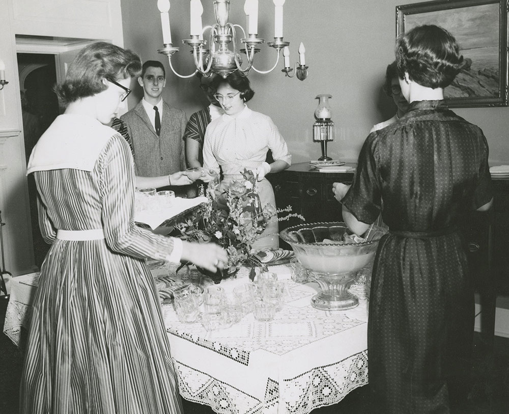 Formerly the home of the Darlington family, Tanglewood has been the home of West Chester State College (later West Chester University) presidents since 1931. It was built in 1787 as a stone farmhouse and named for the weeping beech trees surrounding the property. The West Chester Normal School, which later became West Chester University, bought the property in 1916 from the N. Cresson Walters family for $7,000. During the early years of WCU’s ownership, the property was a working farm supplying the campus with meat, vegetables, and fruit and served as the outdoor farm “laboratory,” offering students the opportunity to observe the latest agricultural techniques (Sturzebecker, 1971). During World War I, in response to government requests to ration food, the farm was a source of food for the school’s dining room (Krulikowski, 2021).