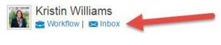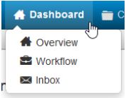 In the Dashboard menu on the global navigation bar, users can find links to Workflow and Inbox. These options are also found beneath the user's name on the Dashboard overview page.