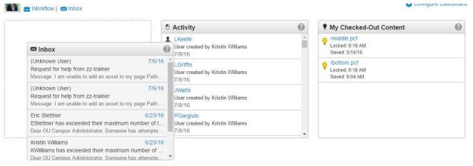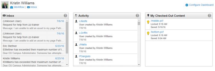 - Configure Dashboard: Once specific Dashboard gadgets have been configured to be available for a group of users, members of the group can choose which gadgets to show on the main content area. The Configure Dashboard feature can be used by each individual user to choose which gadgets to show in the main content area. 28 Frequently displayed gadgets include an activity feed of recent site activity, the system inbox for messaging and notifications, a list of pages that are currently checked out by the user, and site analytics. Dashboard gadget can be reordered by clicking the gray title bar and dragging to the new location.