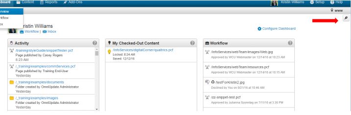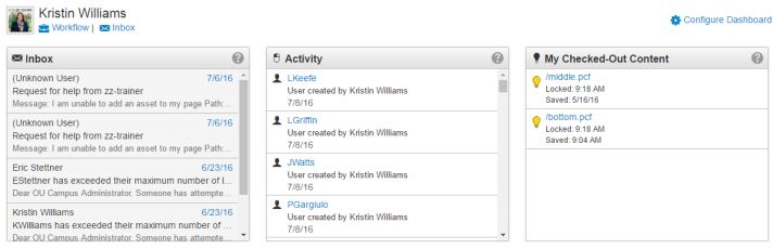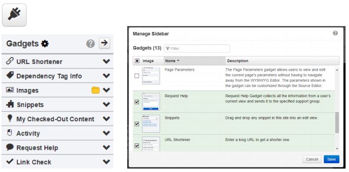 Gadgets are additional tools provided in OU Campus. Gadgets are available in both the Gadgets Sidebar and the Dashboard. Gadgets are context aware meaning that certain gadgets will be available in one location but not the other. Certain gadgets, like snippets and images, will also only be available in the JustEdit editor while users are editing content.