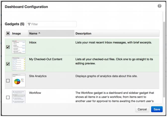 2. To enable or disable gadgets, click the Configure Dashboard link, and click on any number of the available gadgets to enable or disable them. Enabled gadgets are highlighted green. Click Save when done.