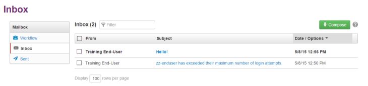 The Inbox is similar to a standard email inbox. Users can navigate to the Inbox from the Dashboard menu in the Global Navigation bar or by clicking the link to the Inbox on the Dashboard itself.