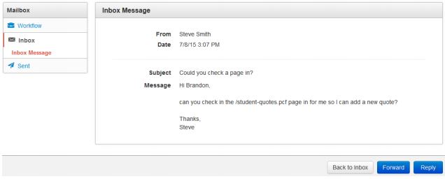 All workflow-related messages reside in the Workflow section of the Mailbox. All other messages reside in the Inbox section, with the ability to compose, reply, forward, and delete messages, as well as view sent messages in the Sent section.