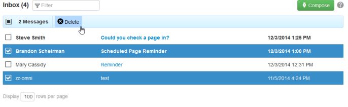 A message may be deleted by hovering over the message row in the Inbox list view and clicking Delete. Multiple messages may be deleted by selecting the checkbox next to each message and clicking the Delete icon that appears in the top row.
