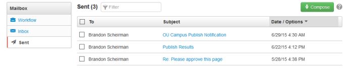 The Sent list view shows messages that the user has sent and messages that were sent in association with scheduled publishes, reminders, and the workflow process. If a message that has been sent to the user is replied to or forwarded, then that is also shown on the Sent screen.