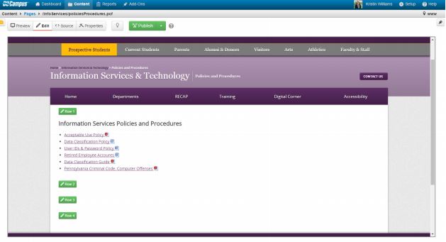 Content contributors and administrators alike can log in to OU Campus through a published page with the use of an on-page link known as DirectEdit™. DirectEdit can be a link, a button, an image, and more anywhere on a published page, as it can be styled to match the look and feel of the site. Typically, every page of a web site managed by OU Campus includes a DirectEdit link to allow content contributors to log in directly to edit a page.