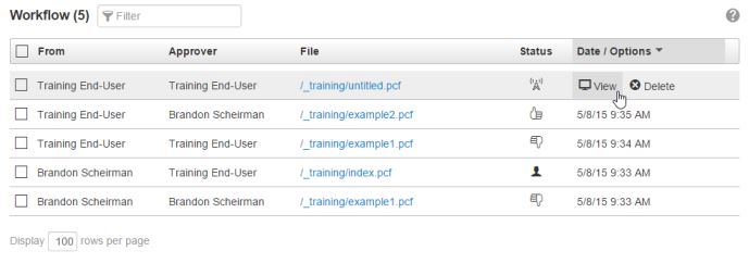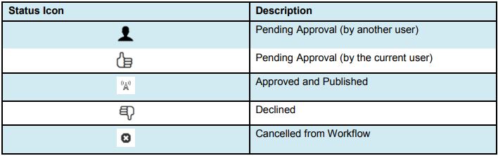 A status icon is shown in the Status column for each content item. Content listed in Workflow can be previewed by any user, but only the user to whom the content was sent has the file checked out and can perform other actions upon it. Clicking a status icons shows the Workflow Message.