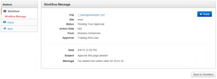 Workflow is a component of the Mailbox that allows users to track content that has been sent for review through the approval process. The Workflow list view shows content that the current user has submitted to another user or received from another user. Additionally, content that has passed through or completed a workflow process (such as when content was approved and published, the request was declined, or canceled) is also shown in this view.