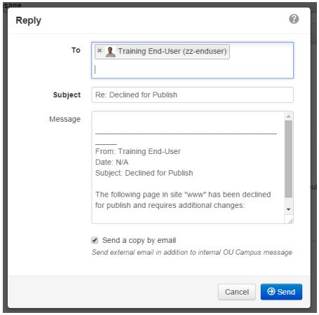 Users can reply to workflow messages by clicking the Reply button in the message. The Reply modal is shown. Additional users or groups can be added to the message, the subject can be changed, and a message can be added. Optionally, a copy of the message can be sent by email in addition to the internal OU Campus message.